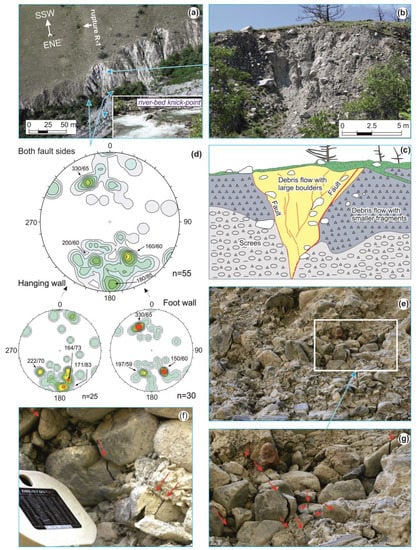Site 4: (a) Shear zone R-1; (b,c) light brown cemented debris flow deposits filled the rupture (see location in Figure 4); (d) diagrams of fractures in the alluvium underlying debris flow deposits (Wulff net upper hemisphere projection; n—number of measurements; counting circle size 1%; intensity isolines are 1, 2, 3 and >; different colors show density concentration from 0 (white) to >9 (red)); (e–g) fractures in alluvium shown by red arrows.