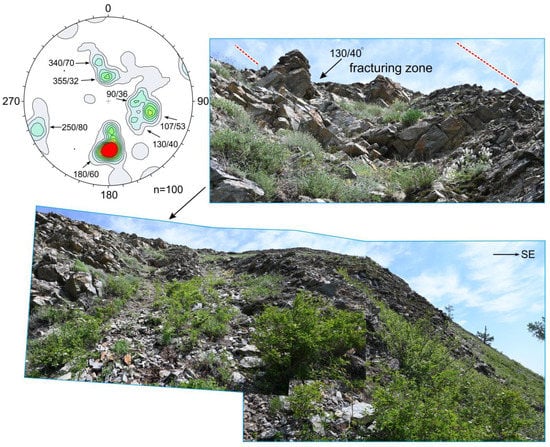 Debris flow deposits on the left bank of the Rita River are underlain by fractured Precambrian granite outcropping at site 3 (53.84909° N; 108.04903° E, Figure 8). Moreover, there are no morphological features for its continuation from the right to the left bank. However, the fresh appearance of fracturing and the external loosening of the massif indicate that the rocks have experienced shaking. Furthermore, the top curve of the surface is suggestive of a graben like the ones described in Nevada after the earthquakes of 16 December 1954 []. The main fracture systems trend predominantly NE, NNE, and N-S, typical of the Baikal rift zone.