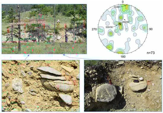 The host sediments in the upper part of the section are also represented by debris flows, but their clasts size is smaller, and their ratio with the matrix is different. In the lower part, the sediments overlie on intensely fractured and loosened alluvium of the Rita River (Figure 7e–g). The main fracture systems affecting the pebbles trend northeastward and nearly E–W (Figure 7d), with the former dominating in the footwall and the latter in the hanging wall. If the maxima in the diagram representing the two fault sides (330°/65° and 160°/60°) are considered conjugate systems, we may assume that they were formed under NW–SE tensile conditions. In this stress field, left-lateral displacements occurred along the E–W trending shears, and normal offsets happened along the NE trending fractures. Already 20 m from the main rupture R1 (Figure 7a–c) downstream of the Rita River, cracks in pebbles were not observed.