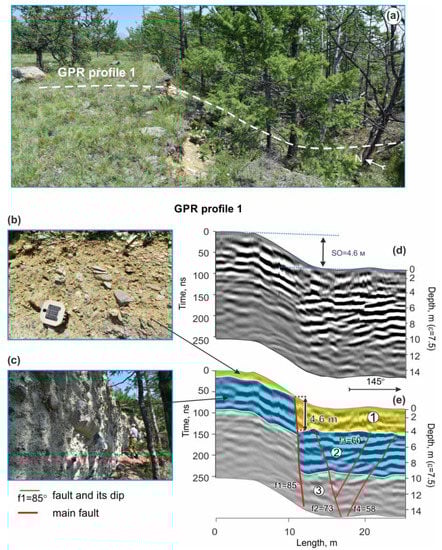 - Lunina, O.V.; Gladkov, A.S.; Gladkov, A.A. Surface and shallow subsurface structure of the Middle Kedrovaya paleoseismic rupture zone in the Baikal Mountains from geomorphological and ground-penetrating radar investigations. Geomorphology 2019, 326, 54–67. [Google Scholar] [CrossRef]