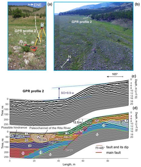 GPR lines were surveyed across the strike of the mapped paleoruptures in the distal part of the Rita River delta (Figure 4). Among other geophysical methods, the GPR is the most suitable tool for paleoseismic studies [,,]. With the correct selection of antennas, depending on the geotechnical conditions of the terrain, section structure, proposed displacement values, and ground electrophysical parameters, it can measure offsets close to the real displacements [,,,,,]. In addition, the GPR is a noninvasive method that is very important for using it in the Baikal-Lena Nature Reserve.