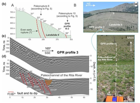 The GPR profile 3 begins at coordinates 53.8483° N, 108.06757° E, crosses a paleorupture at the base of seismogenic landslide II from the left bank of the Rita River, and ends at coordinates 53.84879° N, 108.06725° E (Figure 5 and Figure 12). Due to the steep slope, the scarp quickly denudated here, and the delta plain flattened out. Consequently, stratigraphic markers correlated on both sides of the scarp are absent on this site. Nevertheless, the slope angle near the base of the slope increased, which indicates that the bottom of the landslide was indeed affected by faulting (Figure 12a,b). These observations are confirmed by the GPR image, which clearly shows oblique, near parallel reflection events associated with a 22 m wide rupture zone, where fracture planes dip from 59° to 70° to the southeast (Figure 12c,d). A particular river channel, observed in the GPR profile 2 (Figure 11) and on the map of 1908 [,], coincides with the marginal rupture (Figure 12). Determining the throw of that fault from the GPR profile 3 is difficult since it was apparently accumulated of small offsets on each fault.