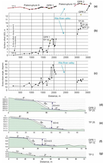 To the southwest of the Rita River, the maximum vertical single-event offset established along the surface rupture is 5 m, while the average is 2.2 (Figure 13b, Table 1). The absolute convergence of measurements from GPR and topographic data at the same site (see Figure 10d,e and Figure 13b, GPR 1 and TP 15) support the robustness of the obtained values. Steep slope angles at some measurement sites (Figure 10c and Figure 13c) suggest a high degree of sediment cementation at the moment of the earthquake. To the northeast of the Rita River, the maximum of 12.5 m displacement, established from GPR data, is likely the sum of two slip events: 7.9 m for the first paleoearthquake and 4.6 m for the second one. The scarp does not have nickpoints (Figure 13d,e, TP 25 and TP 26) that indicate a relatively short recurrence interval, no more than a few thousand years [], p. 216.