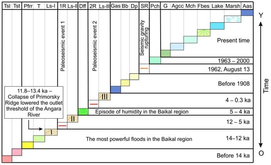 A sharp lowering of the erosion baseline could have occurred due to a catastrophic event in the south of Lake Baikal at the end of MIS 2 (~11.8–13.4 thousand years ago), which led to the next collapse of a part of the Primorsky Range and a lowering of the spillway threshold of the Angara River for several tens of meters []. Another possible reason for the dropping level of Lake Baikal could be a global climatic event at ~11.5 ka when the Marmara sea level was ~90 m down during the Younger Dryas [].