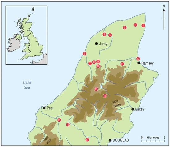 The Isle of Man is unique, in the wider context of Britain and Ireland, occupying a position in the centre of the Irish Sea midway between the two much larger landmasses (Figure 1). Holocene pollen records have only recently become available for the Isle of Man [], but Lateglacial to early Holocene palaeoecological data and the present and historical flora suggest that the island differs floristically from regions surrounding the northern Irish Sea basin. Godwin [] proposed that the early isolation, small size and limited elevation of the Isle of Man had led to a greatly impoverished flora in comparison with Ireland, Britain and mainland Europe. Birks and Deacon [] confirmed the status of the Isle of Man as a floristic special case through numerical analyses on the contemporary flora identifying that the island was significantly dissimilar to other regions. It is possible that the relatively small size of the island and its reduced range of available plant habitats and soil types might have been at least partly to blame for the disparity with Britain and Ireland [], as the Lateglacial and earliest Holocene palaeobotanical record shows that many of the island’s native flora were present before severance from Britain []. Despite recent introductions the restricted Manx (Isle of Man) flora continues to be impoverished [,]. The prehistoric floral and faunal evidence for the Isle of Man [,] suggests that the island has formed a distinctive biogeographical unit since deglaciation.