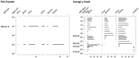 Percentage pollen diagrams from Port Cranstal and Curragh y Cowle, Isle of Man, showing selected tree taxa and 14C BP AMS ages.