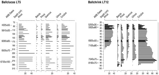 Percentage pollen diagrams from Ballaclucas LT5 and Ballachrink LT12, Isle of Man, showing selected tree taxa and 14C BP AMS ages.
