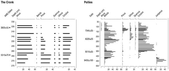 Pollies (SC 348946) is a large basin on the surface of the alluvial fan issuing from Glen Dhoo west of Ballaugh Curragh (Figure 1, site 7). In addition to the many kettle holes that occur within the deglaciated terrain of the Isle of Man, there are also likely pingo remnant features on the alluvial fans at the foot of the upland, particularly on the large fan near Ballaugh. Again, tripartite Late Glacial sediment sequences occur at the base of these depressions below variable thicknesses of Holocene lacustrine muds and peats. Most of the interstadial sediments are lake marls and it is in these units that most of the Giant Deer remains have been found. Pollies is only a few hundred metres from the depression at Loughan Ruy, which contained radiocarbon dated Megaloceros remains []. A new AMS-dated early Holocene pollen sequence has been produced from the overlying organic deposits at Pollies and provides important information on the early Holocene vegetation history. Pollies contains a comprehensive picture of the pollen stratigraphic changes during the earlier Holocene (Figure 5), with increases to the rational limits of Juniperus, Betula, Corylus, Ulmus and Quercus, as well as the Alnus empirical rise, all of which have been radiocarbon dated.