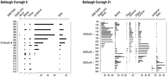 Percentage pollen diagrams from Ballaugh Curragh 6 and Ballaugh Curragh 21, Isle of Man, showing selected tree taxa and 14C BP AMS ages.