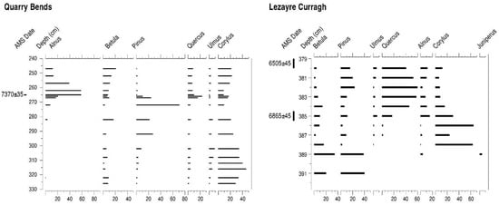 Percentage pollen diagrams from Quarry Bends and Lezayre Curragh showing selected tree taxa and 14C BP AMS ages.