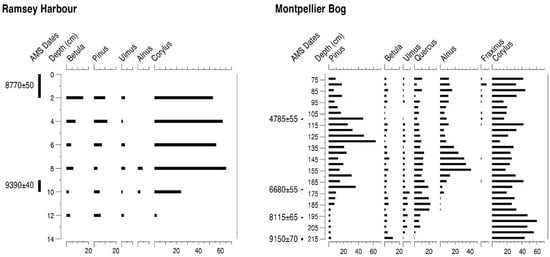 Percentage pollen diagrams from Ramsay Harbour and Montpellier Bog, Isle of Man, showing selected tree taxa and 14C BP AMS ages.