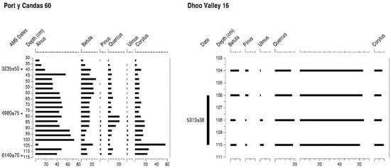 Percentage pollen diagrams from Port y Candas 60 and Dhoo Valley 16, Isle of Man, showing selected tree taxa and 14C BP AMS ages.