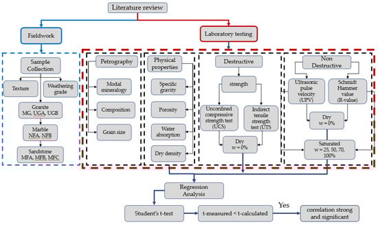 Table 2 shows the three granite samples (MG, UGA, and UGB), two marble samples (NFA and NFB), and three sandstone samples obtained in the field (MFA, MFB, and MFC). Selected samples were homogeneous in terms of their fundamental properties, such as texture and weathering grade. Weathering grades (WG) were assigned following the study of Borrelli et al. (2007). Figure 2 shows the flow chart of the research methodology. For NDT, strength, and physical testing, samples were taken to the Geotechnical Engineering Laboratory at the National Centre for Excellence in Geology (NCEG) in Pakistan. Three NX-size (54.75 mm) core specimens were obtained from each sample. A polarized microscope (Microscope Model Eclipse LV100ND of Nikon, Tokyo, Japan) was used for petrographic investigation. To get an idea of what minerals were present in the sample, the mineral composition and grain size were visually analyzed according to BS EN 12407 (British National Standards) [59].