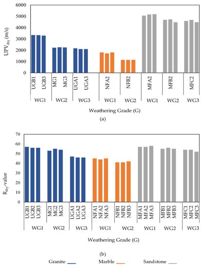 The relationship between NDTs in dry states (UPVdry and Rdry-value) and weathering grades is shown in Figure 4. Both NDTs dropped as weathering grades increased for all the rocks studied. Weathering weakens rock-forming minerals and stiffens grain boundaries, as well as causing dissolution and leaching of mineral phases, resulting in high porosity. The propagation of UPVdry is slowed when there are more pores and micro-fissures [67]. Similarly, increasing porosity affects the rock’s hardness and strength, resulting in lower R-dry values [69]. Granite, basalt, and quartzite all have equivalent UPV and R-values, according to Gupta and Rao [70] and Gupta et al. [5].