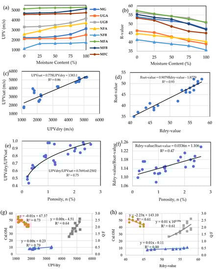 Variation of UPVdry and Rdry (a,b) with moisture content (c) UPVsat vs. UPVdry (d) Rsat-value vs. Rdry-value (e) UPVdry/UPVsat vs. Porosity (f) Rdry-value/Rsat-value vs. Porosity. (g) Cal:OM vs. UPVdry (h) Cal:OM vs. Rdry-value.