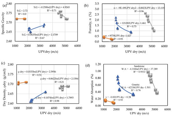 Correlation of UPVdry against (a) specific gravity, (b) porosity, (c), dry density and (d) water absorption for granite, marble, and sandstone. Granite –– Marble –– Sandstone ––.