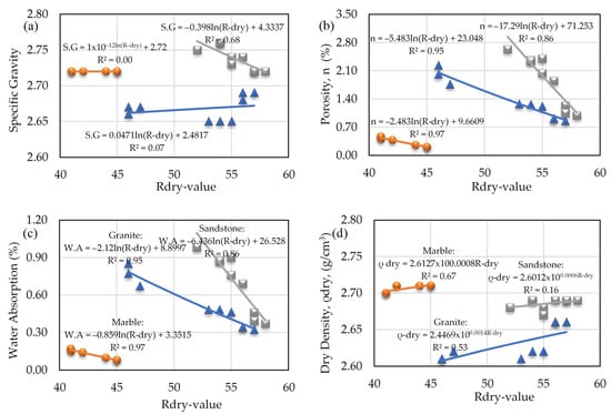Correlation of Rdry-value against (a) Specific gravity, (b) Porosity, (c) Water absorption and (d) dry density for granite, marble and sandstone.