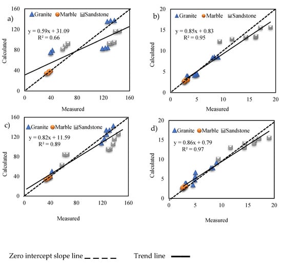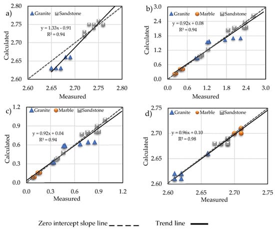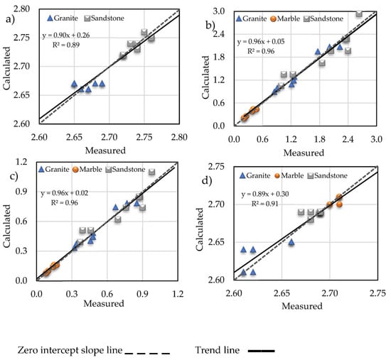 Similar correlations have been suggested for calculating various physical characteristics in a range of rock types using the UPV [27,28,75] and R-values in previous research. The computed physical parameters were obtained using the equations given in each of the correlative charts (Table 6 and Table 7). The zero-intercept slope lines in Figure 8 and Figure 9 demonstrate the magnitude of inaccuracy in estimated and observed physical parameters. The data points that are far from the zero-intercept slope line indicate an error, while those that are above it indicate correctness. Because the computed t-values are bigger than the crucial t-values, the student’s t-test at the 95% confidence level is significant for all associations between the UPV-dry and R-dry versus physical characteristics, as shown in Table 6.