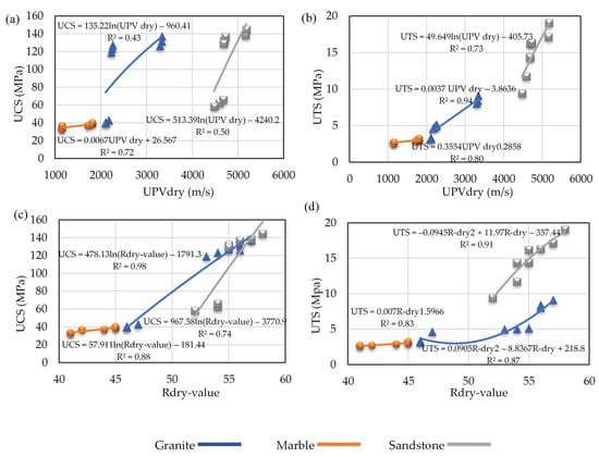 Correlation of NDT against UCS and UTS for granite, marble, and sandstone (a) USC vs. UPVdry (b) UTS vs. UPVdry (c) UCS vs. Rdry-value. (d) UTS vs. Rdry-value.