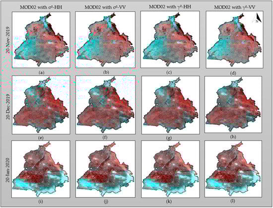 Image fusion of SCATSAT-1 (level 4) and MODIS (MOD02) of images (a–d) from 20 November 2019; (e–h) from 20 December 2019; and (i–l) from 20 January 2020 using different parameters, i.e., σ°-HH, σ°-VV, γ°-HH, and γ°-VV.