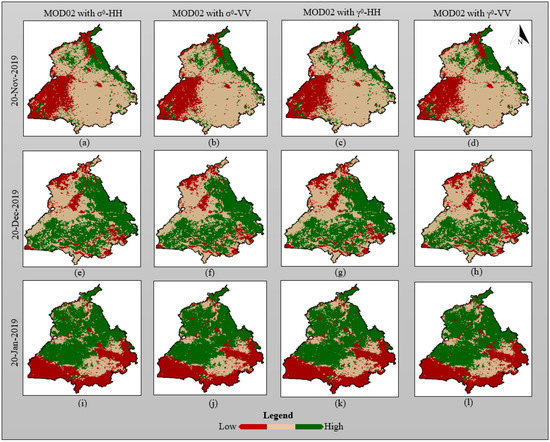 Random forest-based classified maps were generated from the fused dataset (SCATSAT-1 and MODIS) for (a–d) 20 November 2019; (e–h) 20 December 2019; and (i–l) 20 January 2020 using different parameters, i.e., σ°-HH, σ°-VV, γ°-HH, and γ°-VV.