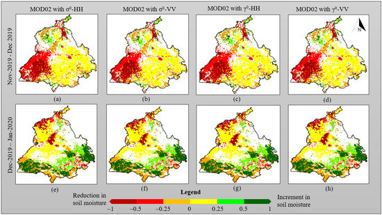 PCCD change maps generated from the fused dataset (SCATSAT-1 and MODIS) for (a–d) November 2019–December 2019 and (e–h) December 2019–January 2020 using different parameters, i.e., σ°-HH, σ°-VV, γ°-HH, and γ°-VV (Note: SM: Soil Moisture).