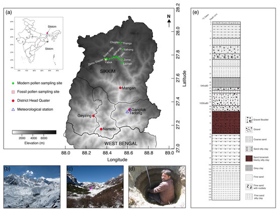 (a) Site map showing location of modern pollen sites, fossil pollen site, and meteorological stations are having temperature and precipitation records. (b) Snout of Zemu Glacier. (c) Broad landscape of the fossil pollen sampling site. (d) Sampling trench for sediment collection and (e) fossil sampling profile.