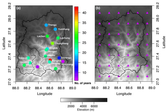 Distribution of (a) precipitation meteorological station network with number of years records. (b) The CRU 10 min climate grids points used to interpolate the modern climate data of modern surface pollen sites. The map is generated using digital terrain elevation dataset SRTM30 (http://srtm.csi.cgiar.org, accessed on 10 January 2022).
