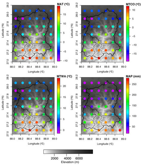 Range of climatic variation of CRU 10 min climate gridded data (MAT, MTCO, MTWA and MAP) in Sikkim and its vicinity along with elevation gradient. The map is generated using digital terrain elevation dataset SRTM30 (http://srtm.csi.cgiar.org, accessed on 10 January 2022).