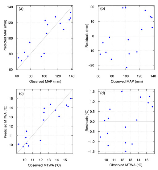 The RDA shows that there is a statistically significant relationship between modern pollen assemblages and the climatic variables MAP and MTWA (Figure 5). A transfer function was developed for MAP and MTWA as these were the significant climatic variables entered in the ordination analysis, RDA. Prior to final model development, we found four samples (SKM022, SKM069, SKM074 and SKM101) producing extreme values in the analyses. These sites were removed from the training set prior to performing PLS regression and calibration. The improved pollen-climate PLS transfer function was finally developed based on the screened dataset (Table 2). The performance of transfer function models for MAP and MTWA assessed with components retained in the PLS regression approach and assessed by leave-one-out cross-validation showed the sixth component for MAP and the fifth component for MTWA to be the best performing models (Table 2, Figure 7). The sixth component of MAP showed the lowest value (17 mm) of RMSEP and the highest value (0.585) of r2 between observed and predicted MAP (Table 2). A strong relationship (r2 = 0.993, p < 0.01) was observed between observed MAP and the values predicted for the study sites based on observed MAP (Figure 7). In the case of MTWA, the fifth component showed the lowest value (1.1537 °C) of RMSEP and the highest value (0.696) of r2 between observed and predicted MTWA (Table 2). A strong relationship (r2 = 0.982, p < 0.01) was observed between the observed MTWA and the values predicted for the study sites based on the observed MTWA (Figure 7). A comparison of observed MAP and MTWA and residuals (predicted minus those observed for MAP and MTWA) showed that the calibration model predicts values relatively well within the range of observed MAP and MTWA (Figure 7).