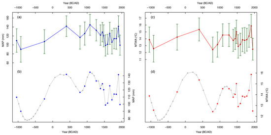 Reconstructed climates (a,b) MAP and (c,d) MTWA since 2992 cal years BP (1042 BC). The grey dots in both the figure are interpolated values where the palynomorphs are not recovered.