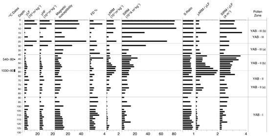 The measured environmental magnetic parameters are also sensitive to magnetic grain size variations, and, subsequently, the determination of environmental changes at the site and depositional environments [89,90,91]. The magnetic grain size and thus domain structure of iron minerals in sediments range between multidomain (MD), stable single domain (SSD or SD), pseudo-SD (PSD), and superparamagnetic (SP) grains. Information about the magnetic grain size in sediments can be used to identify sediment provenance areas [102,103]. We describe here the magnetic mineral data with reference to the pollen zone constituting the sediment profile. This has been carried out to identify the similarities and significance of the magnetic data and the palynological interpretations.