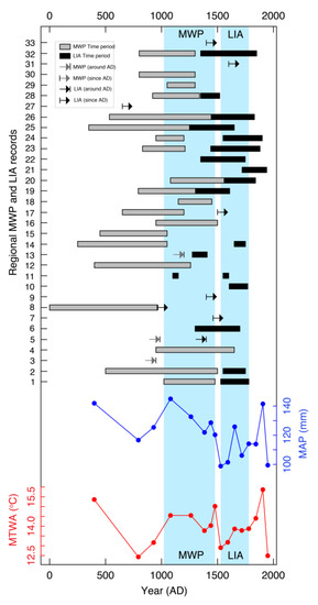 Similarly, the present reconstructed temperature (MAT) has been compared with temperature reconstructions from adjoining areas and regional, Arctic, hemispheric and global records (Figure 13). The tree-ring-based June–August temperature reconstruction from Bhutan [16] shows cold conditions during the early 15th, 16th, and late 17th to early 18th centuries. Another tree-ring-based temperature reconstruction from Nepal [200] also shows a lowering of temperature during AD 1670–1770, which falls in the period of LIA. In addition, temperature reconstruction for Asia [213] using multi-proxy records, temperature reconstruction using stalagmite records from Beijing, China [214], temperature reconstruction in China using proxy records with methods of principal component regression and partial least squares regression [215], and Arctic-wide temperature reconstruction for the past 2000 years [216] also show comparable variability with the present reconstructed temperature. The temperature reconstructions available from various hemispheric and global levels include: multi-proxy reconstructions of the extra-tropical northern hemisphere (30–90° N) mean temperature [217]; reconstructions of northern hemisphere temperatures and climate forcing over the past 1000 years using multi-proxy records [218]; low-frequency temperature signals reconstructed using Regional Curve Standardized tree-ring chronologies from 14 sites in the northern hemisphere extra-tropics [219]; northern hemisphere high-elevation tree-ring-based temperature reconstruction using the regional curve standardization technique [220]; multi-proxy northern hemisphere temperature reconstruction using inverse regression-truncated EOF climate field reconstruction [221]; northern hemisphere temperature reconstruction calculated by combining low-resolution proxies with tree-ring data [222]; multi-proxy northern hemispheric surface temperature reconstruction [223]; and multi proxy global surface temperature [224] also show similar temperature variability to the present temperature reconstruction in different time periods, especially during MWP and LIA (Figure 13). However, the differences in variability in both the temperature and precipitation comparative analysis with the present climate reconstruction might be due to the differences in the proxy data used, the reconstructed seasons, and the resolution of the proxies.