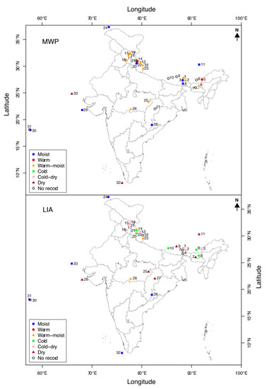The climatic variability during the MWP and LIA time periods recorded in the present pollen-based climate reconstructions is comparable with other pollen and proxy-based studies carried out in different regions of India, the Himalayas, and the adjoining oceanic region. The time span and climatic inference made for the MWP and LIA periods in these studies [16,84,85,87,158,165,166,167,168,169,170,171,172,173,174,175,176,177,178,179,180,181,182,183,184,185,186,187,188,189,190,191,192,193,194,195,196,197,198,199,200,201,202,203,204] are presented in Figure 10 and Figure 11, respectively, and are described in the following section. We have given an extensive explanation and comparison of these records in Supplementary Information.