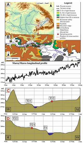 On its lower reaches, the course and the dynamics of River Mureş (Maros) are determined predominantly by the continuous subsidence of the Lower Tisza Graben [19], and on its upper reaches by the differential uplift of mountain ranges surrounding the Transylvanian Basin [20,21]. Along its course from the Transylvanian Basin to the Great Hungarian Plain, the river has followed the tectonic line between the Southern Carpathians and the Apuseni Mountains, at least since the Upper Pliocene [22]. Early research of [23] and [24] separated three terrace levels along this section, belonging to the Early Holocene, Upper, and Lower Pleistocene. Later, [20] and [25] identified five terrace levels, which were attributed to the alpine glaciations Günz, Mindel, Riss, Würm, and the Upper Pliocene. According to [26], the oldest three terrace levels have hardly survived due to erosion, and terraces at a 20–30 m height are actually Würm forms, resulting in an almost continuous flat area almost along the entire valley. Compared to previous authors, a somewhat more detailed classification has been proposed by the Harta geologică a R. S. România, Deva sc. 1:50,000 map, where terrace levels are classified based on their relative altitude above the present floodplain. This way, eight terraces can be separated, though age is not provided.
