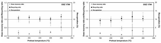 Figure 2. Combined preheat and dose recovery test results for samples OSZ 1790 and OSZ 1794.