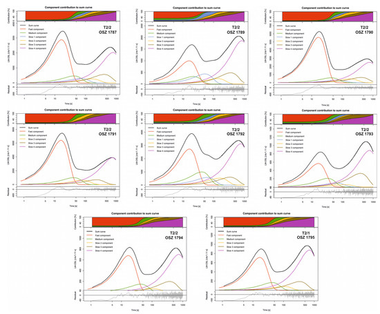 With the use of LM-OSL, six OSL components—one fast, one medium, and four slow—could be resolved in seven out of the eight samples analyzed from terrace T2/2. In the case of one sample (OSZ 1791), five components were identified (Figure 3). No ultrafast component was found in any of the samples, and in the initial part of the signal, the dominance of the fast component was inevitable (Figure 3). Nevertheless, the intensity of the fast component relative to the overall signal, i.e., the fast component ratio, shows considerable differences from sample to sample. Sample OSZ 1793 exhibited the lowest (3%), and sample OSZ 1790 had the highest (7%) value in this respect. On average, the ratio of the fast component was 5% in the case of T2/2 samples.