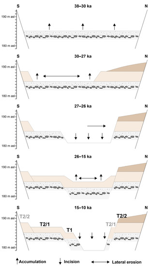 The presence of an upward fining overbank sequence above the channel deposits at site T2/2 indicates medium energy floodplain development between 30 and 27 ka, supplemented by additional sediments arriving from small subsequent valleys (Figure 5). However, by the end of the period, coinciding with the climatic transition between MIS 3 and MIS 2, a considerable incision started (Figure 5). Applying the general model of climate forcing, this incision can be explained by increased runoff due to decreasing evapotranspiration as a consequence of climate deterioration and decreasing vegetation cover, see, e.g., [62,63,64].