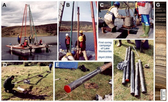 First coring campaign of Lake Montcortès in April 2004 using a Kullenberg platform and gravity corer. (A) General view of the coring platform. (B) Placing the corer in position. (C) Loading the corer for maximum penetration. (D) The corer with the sediment recovered inside. (E) Extruding the core. (F) The core once split for transportation. (G) Image of core MON04-1 A-1K showing the seasonal laminations.