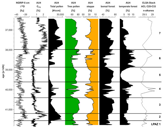 During the last 60,000 years, European climate underwent rapid shifts between cold-arid stadial periods and warm-humid interstadial periods. These oscillations were first identified in Greenland ice [1] but can also be found in Eurasian terrestrial [2,3,4,5,6] and in marine [7,8] sedimentary records (Figure 1). The maars in the Eifel mountains, Rhineland-Palatinate, Germany are a unique archive representative for central European climate of the past 500,000 years [9] (Figure 1). Organic carbon records from Pleistocene Auel infilled maar that erupted about 60,000 years ago show shifts that reflect changes in paleobioproductivity in the lake, which is a function of temperature and thus climate fluctuations [3]. The analysis of pollen and spores of coprophilous fungi (SCF) indicates that vegetation patterns and the herbivorous megafauna biomass also followed these climate shifts during the past 60,000 years [2] (Figure 2): During the early Marine Isotope Stage (MIS) 3 (60,000–49,000 yr b2k), mixed forests dominated by Picea and Carpinus were present in the Eifel. With climatic deterioration during Mid and Late MIS3 towards the Last Glacial Maximum (23,000–19,000 yr b2k), a cold temperate mixed forest developed (48,086 to 35,553 yr b2k), and subsequently a forest-steppe (35,553–28,825 yr b2k) and forest-tundra (28,825–24,209 yr b2k). During MIS2, a polar desert with very low Poaceae pollen values, single finds of Pinus and Betula, and moss remains dominated, followed by a succession of boreal forest and warm temperate forest during the Pleniglacial and the Holocene (24,209 yr b2k–present).