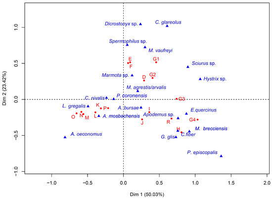 Correspondence analysis (CA) between rodent species and layers of the Arago cave. Axis 1 represents 50.3% inertia and axis 2 represents 23.2% inertia.