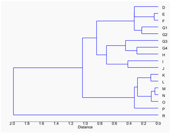 On this factorial level, the clustering of the major stratigraphic units can be distinguished, in much the same way as in the previous study [27]. Nevertheless, the subdivisions of SU G reveal a convergence of SU G3 and G4 with SU H, I and J of Ensemble II. The same is true for SU R, which joins the levels of Ensemble II attributed to a temperate episode. SU G1 and G2 are grouped with the other stratigraphic units of Ensemble III. The dendrogram produced via the cluster analysis gives us a better view of the groupings of levels. (Figure 3). We can observe a grouping that corresponds to the stratigraphic ensemble except for the clustering of SU G3 and G4 with the other layers of Ensemble II. This leads us to assume that the climatic transition between Ensemble II and Ensemble III occurs between SU G2 and G3 and not between SU G4 and H.