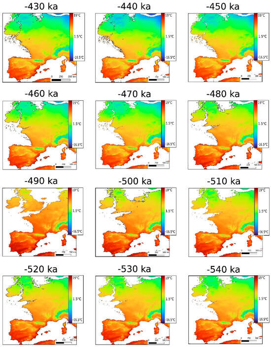 To compare our local data with global variations we rely on the ‘Oscillayer’ data. This dataset builds upon interpolated anomalies (Δ layers) between bioclim layers of the present and the Last Glacial Maximum (LGM) that are scaled relative to the Plio-Pleistocene global mean temperature curve, derived from benthic stable oxygen isotope ratios [41]. These data allow us to display the evolution of the climate variables in a global way at 10 ka intervals. In this case, we are interested in the variations in the mean annual temperature. These data were processed using QGIS software (version 3.28.0).