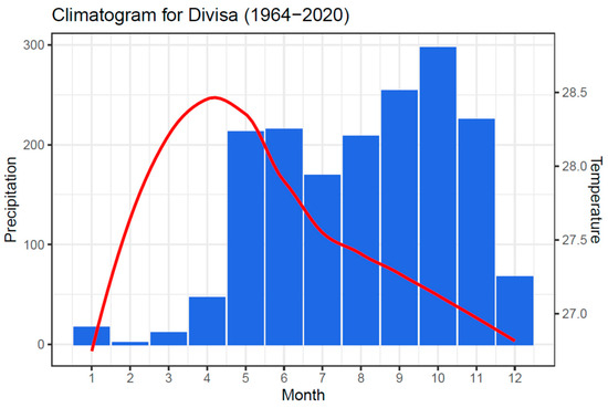 Figure 2. Climograph of Divisa for the period 1964–2020. The red line represents mean monthly temperature, the blue line means monthly precipitation totals.