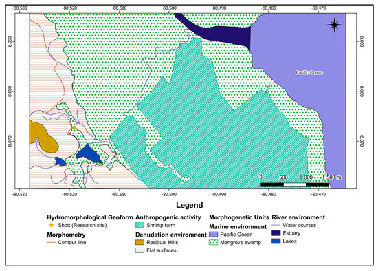 A detailed geomorphological map, which was created based on a combination of terrain analysis and satellite imagery interpretation within the GIS environment, has been additionally verified by a field survey. As a result, the created geomorphological map has allowed localization of the study area within the marine–coastal fringe. The study area is located at ±848 m from the perimeter that circumscribes the existence of a coastal lagoon (Figure 3). Consequently, the area that circumscribes the geosystem and exposes its geofacies was constructed (Figure 4), where the existence of a fluvial–marine plain that harbors mangroves stands out.