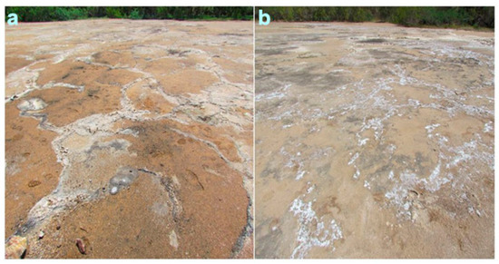 While during the rainy season, the littoral shott exposes a polygonal beach defined by overhanging calcareous crusts (Figure 5a), during the dry season, it exposes the polygonal beach covered by salt precipitates (efflorescence), a product of intense evaporation (Figure 5b; Table 1). It should be noted that in the geosystem that encloses the research site, this landscape unit is used for commercial purposes for the development of shrimp farms. In addition, adjacent to the perimeter that circumscribes the lagoon are the halomorphic soils, typical of the fluvial–marine plains on which mangrove forest develops.