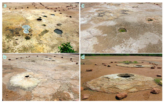 The dissolution of evaporites is also responsible for the evolution of certain karstic micro-forms that are present within the studied littoral shott. These include several domical micro-forms that are present within two studied sites (2 and 4) within the littoral shott (Figure 6d). The diameter of these domical micro-forms ranges from 24 up to 87 cm, the depth ranges between 12 and 63 cm, and the height is significantly lower, ranging between 14 and 16 cm. While two domical micro-forms that were detected within site 2 have smaller diameters, heights and especially depths, four domical micro-forms located within site 4 have considerably larger diameters and depths, with slightly higher heights (Table 1). It is not uncommon that in areas with the presence of evaporites (salts), superficial and subsurface karst dissolution can cause the formation of various closed depressions [56]. The morphology of these domical micro-forms corresponds to the karstic salt domes found in the arid and semiarid parts of the world, which are known for intense evaporation [70]. Furthermore, it should be noted that the finding of these karstic domical micro-forms corresponds to the results of other studies that were carried out in similar tropical coastal areas. The karstic modeling of the relief also develops in evaporites, generating on the shott a varied superficial micro-form, whose formation is conditioned by the composition and depth of the groundwater [59]. These sometimes expose small domical forms, with diameters close to 1 m and 0.5 m high with an average depth of 20 cm. Several authors agree that the genesis of the domes is attributed to the dissolution and in situ precipitation of evaporites [56].
