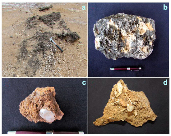 Figure 8. (a) Shelly limestone (coquina) rock outcrop on the geofacies, where remains of shells of marine organisms were observed. (b) Hand sample from the rock coquina outcrop. (c) Fractured hand sample on which bivalve shells are attached. (d) Fractured hand sample within which remains of bivalves and gastropods are embedded.