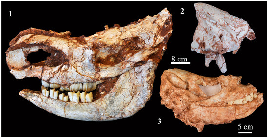 For individual # 8096, we refer to skull fragments, a left mandibular fragment with the p3–m2 (p4–m1 incomplete) and the p2 separated, a posterior fragment of a right lower molar, an isolated right P3 (incomplete), P4 and M3 (incomplete), a left M1 and M3, and numerous postcranial bones (long bones, metapodials, carpals, tarsals, and phalanges). For individual # 8216, the juvenile skeleton, we refer to material including the skull and mandible with milk dentition, and most postcranial bones. For individual # 8661, the sub-adult skeleton, we refer to materials including the skull and mandible with P/p2–M/m3 (P/p4 and M/m3 erupting; left Dp4 in place and right Dp4 separated), and most postcranial bones. The elements previously not assigned a collection number [10] (see [10] (Figure 7)) belong to # 8096, except for the tibia fragment (same side as the tibia of # 8096) which is here assigned to individual # 8661.