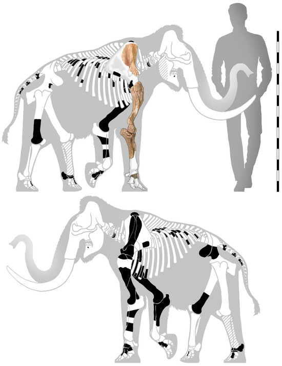 Mammuthus lamarmorai from Guardia Pisano Hill (Gonnesa); schematic drawing of the skeleton showing the main identified bones (black) housed at Museo di Storia Naturale e del Territorio (Pisa), Naturhistorisches Museum Basel, and Museo Sardo di Geologia e Paleontologia “D. Lovisato” (Cagliari); in oblique lines are the bones cited in the literature but not found in the examined collections (lost and/or misidentified elements); scale bar = 150 cm (redrawing from [22]).